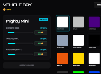 - Deep Upgrade System: Fine-tune your ride! Spend your hard-earned coins to upgrade Engine Top Speed, Handling Precision, and Nitro Power. Watch your stats climb as you level up each part to Level 10.